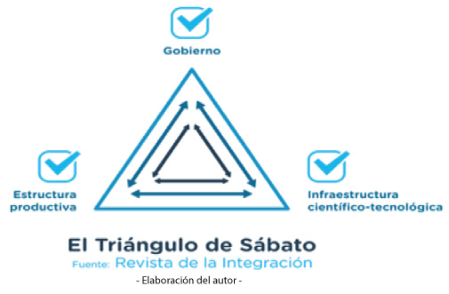 El modelo de explicación de política científica, conocido comúnmente como el “triángulo de Sábato”, explica las relaciones en el orden nacional entre un vértice donde la universidad encuentra un rol destacado como uno de los ejes de la estructura de producción científico-tecnológica; otro vértice representado por el Estado y los diferentes poderes y niveles de estatidad de las políticas de articulación y promoción científicas y educativas; y por último un vértice correspondiente al sector productivo. Este triángulo no solo representa actores o sectores que deben participar del proceso científico y tecnológico, sino que representa un modelo de asignación roles y relaciones tanto hacia adentro de cada uno, como en función del resto y del todo del sistema propuesto.