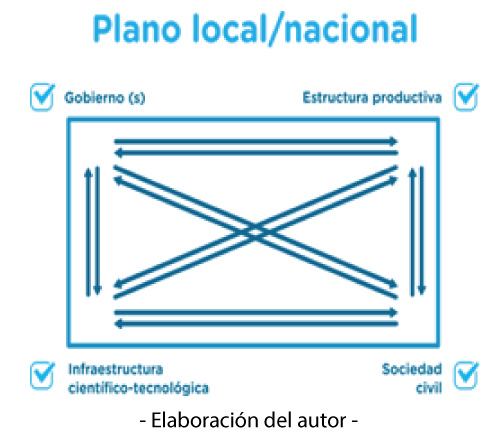 Luego está el entramado que hace al sector/vértice de educación superior, ciencia y tecnología. Allí se observa que el espacio universitario nacional, en el orden internacional, se funde en redes y asociaciones, sean institucionales o disciplinares. En el sector/vértice referido al sector productivo se verifica de qué manera lo nacional -hoy entrelazado con el plano internacional por la globalización, las TIC’s y la expansión del capitalismo en sus diferentes versiones- ha permitido conocer con cercanía el proceso de internacionalización de la economía y por ende de flujos de capital que evidencian empresas globales y redes empresariales. Ante este escenario, sostener posiciones ingenuas no favorece a lo equitativo en términos de relaciones de estos actores para con los otros.
