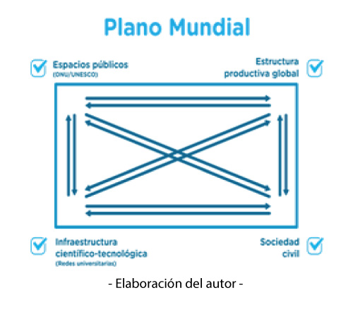 Por lo que cada uno de los sectores/vértices es capaz de producir conocimiento y reproducirlo mediante sus prácticas y relaciones, influyendo en los demás actores. Pero esas figuras -sea triángulo o cuadrado- no alcanzan para explicar plenamente el juego de actores y las relaciones dadas por similares sectores/vértices en el plano internacional. Porque el entramado de relaciones cambia sustantivamente, tanto en amplitud y dimensiones de las relaciones de los múltiples y variados actores, como en profundidad y potencia de esas relaciones en la construcción del conocimiento.